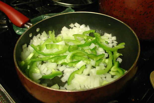 Cocinar la cebolla y el pimiento en dos cucharadas de aceite de oliva durante 3 minutos