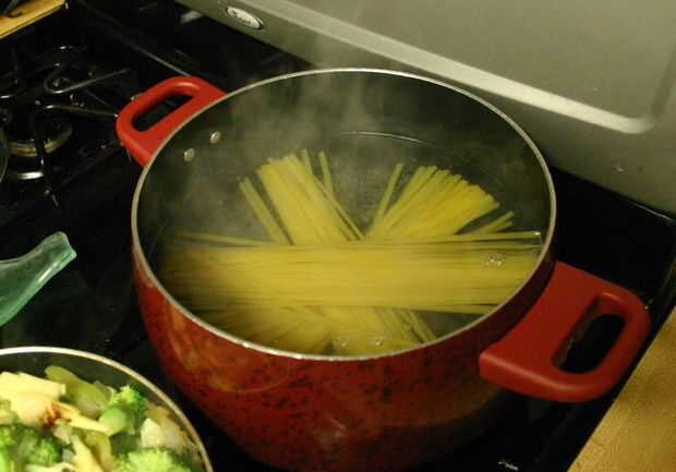 a continuación, cocinar sus fideos según las instrucciones en la caja. Me gusta cocinar mina un poco al dente porque me mantiene ya más completa.