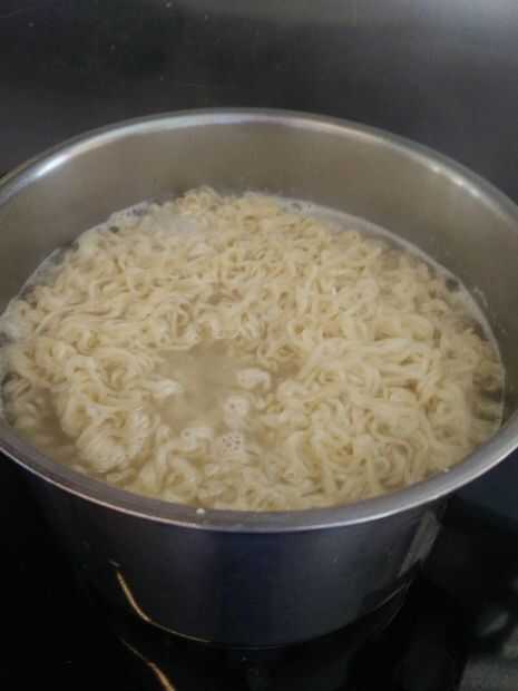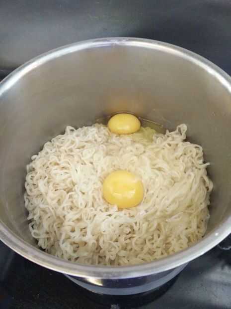 Poner los fideos en la olla, no lo ponga en el calor sin embargo. Agregar 1 huevo (o 2 Si utilizas 4 paquetes de fideos y como el huevo. Pero 1 es también bastante). Sólo mezcle el huevo con los fideos, el calor de la olla los fideos debe ser suficiente para dejar que el huevo a cocinar. No ponga en más calor o bien el huevo se consigue sobre cocido y los fideos será secos.