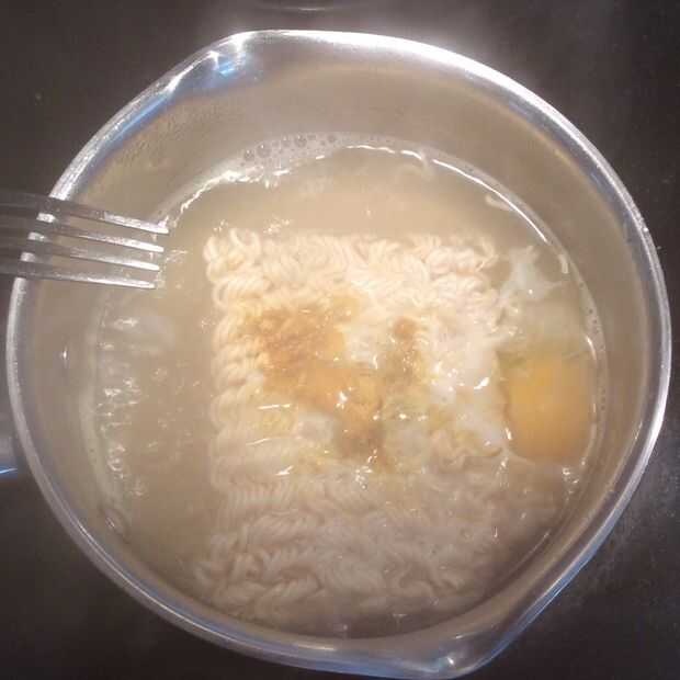 sólo deje caer el interior del huevo en el bote. Entonces puedes empezar a revolver los fideos, condimentos y óvulo junto en la olla. Los fideos deben terminar la cocción en 2-3 minutos.