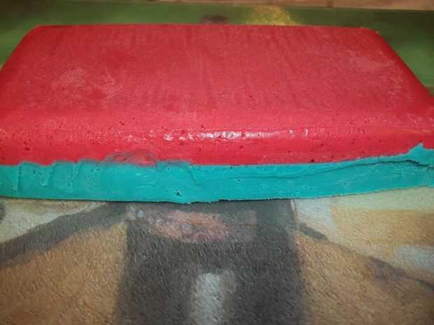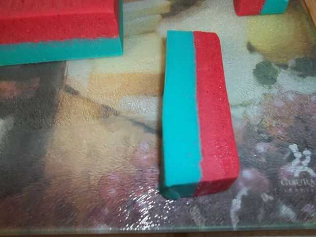 Cortar en tiras largas. Colocar estas tiras dos tonos en los lados y cortar en trozos incluso.