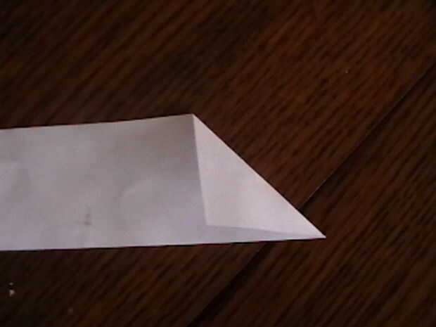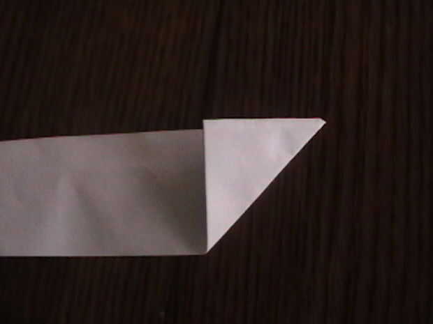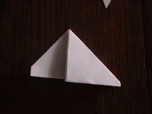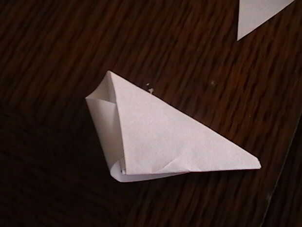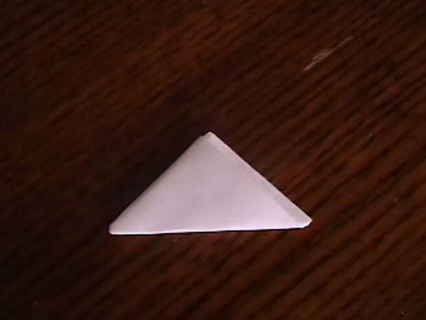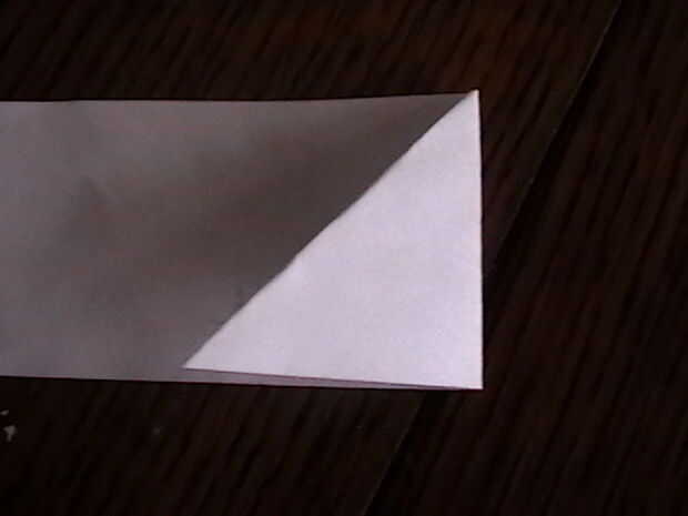 Tomar una de las esquinas y doblar en, la fabricación de un triángulo rectángulo.  Luego doblar el triángulo en su línea vertical hacia el interior del papel. Doblar el triángulo hacia arriba y repita hasta que te queda un pequeño pedazo de papel y el triángulo.  Dobla el pedazo de papel en la solapa en el triángulo.