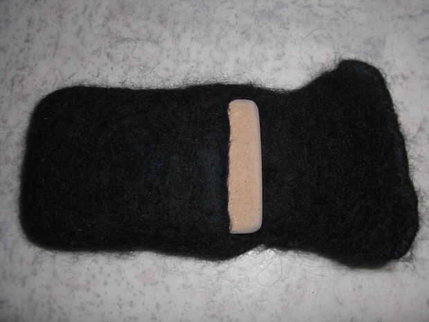 ¿Qué hacer? Introduzca la aguja de fieltrar mágico vista en el cuadro de herramientas. Una aguja de fieltrar tiene pequeñas abolladuras a lo largo del eje que tira de fibras individuales a lo largo cuando usted pega en que le permite unir dos piezas. Así que cuando el fieltro se había secado algunas me suturan los lados. Pero todavía no parecía tan agradable, los lados estaban un poco desgastados y obviamente cosidos. Así que decidí ponerlo en la lavadora a 40 grados (que es "fría" para con esas arandelas americano raras). Guardé el taco de madera y ató la cadena alrededor de él para evitar que el bloque caiga (gomas probablemente sería mejores pero no tengo ninguna). Lamentablemente no creo que tomar alguna fotografía de ella antes de la lavadora así que tendrás que imaginártelo.