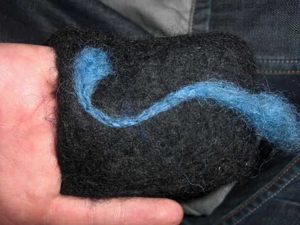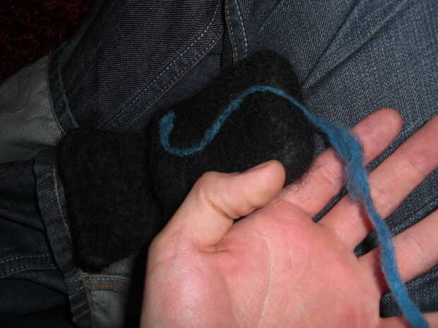 Ahora para decorar! Tuve una idea de algún tipo de patrón de vid con hojas (puedes decir realmente lo estoy inventando improvisador? = D) y descubrí que frío hago especie de cuerdas de hilo enrollando la lana entre las manos. Luego a poner la cadena en el fieltro y la aguja para sujetar, en todo el patrón tomó algo así como dos horas de uso. También necesitaba una manera de cerrar la tapa y la señora encantadora en el taller de hilado sugirió que haría que uno o más prominencias en forma de hongo y los agujeros para poner a través. Esto fue algo sencillo, toma un trozo de lana y empezar a meter la aguja hasta que quede bien ajustado y sujetado. Tenga cuidado de no hacer la base demasiado amplia. Ahora si puedo conseguir solo la idea de que parecen pezones de mi cabeza... = P