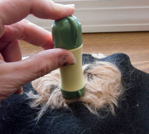 Coloque el cepillo o la espuma bajo la tela que va a ser de fieltro en, separó el pelo del perro encima de la tela (extendiendo las fibras en distintas direcciones) y el punch, punch, punch con las agujas de fieltrar.