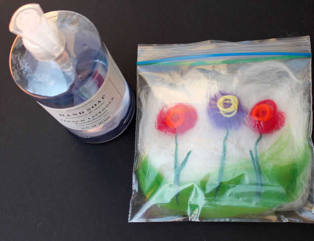 Agregar agua jabonosa en el bolso - 2 cucharadas o menos presión sobre la bolsa para obtener las fibras húmedas.