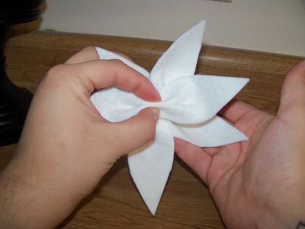 3. Agarrando su X de pétalos de la parte trasera, presione firmemente el tercer pétalo en la parte superior de la X, pellizcando la parte superior central como pulsar. Esto creará seis pétalos espaciados uniformemente.