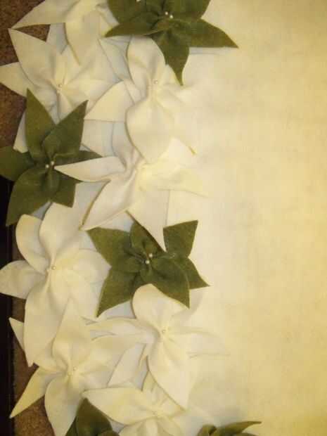 - Comenzar pegando tus flores en el borde exterior de la tela, usando níquel caliente tamaño toques de pegamento caliente y alternando los colores como se desee. Usé dos flores marfil y la tercera oliva. Una vez que te has ido todo el camino alrededor, empujar su patrón por una flor, por lo que su acento de color no está justo en la parte superior de otro y completar el círculo de flores.
