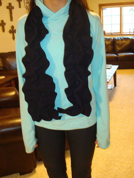 lo cool de lana es que cuando usted la pone aunque el secador fieltros lo que puede cortar el suéter sin terminar los bordes. Decidí aprovechar este suéter de fieltro y bufanda infinity con capucha y polainas con este suéter. Tuve la suerte de qu