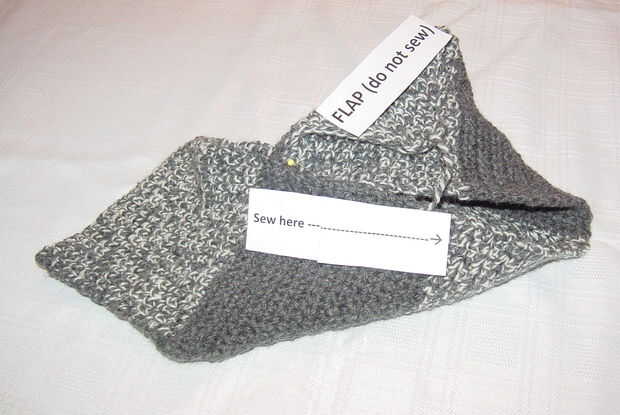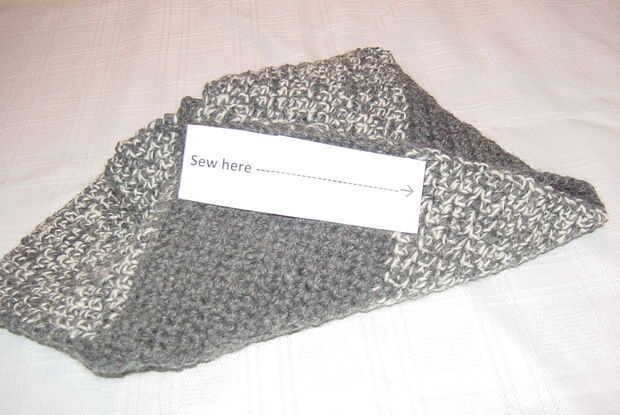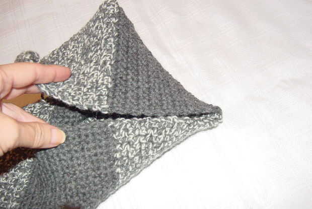 El borde de este último bloque será doblado por la mitad diagonalmente dejando la esquina de "top" como una "aleta" (que se deje sin conectar) y se cose el otro borde al borde libre de la pieza de "dedo".