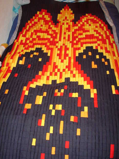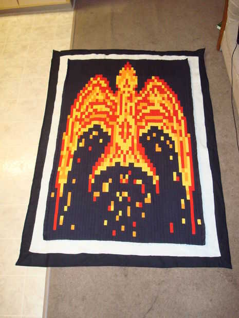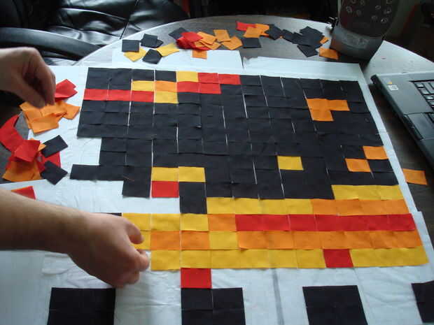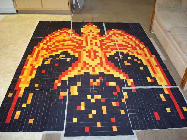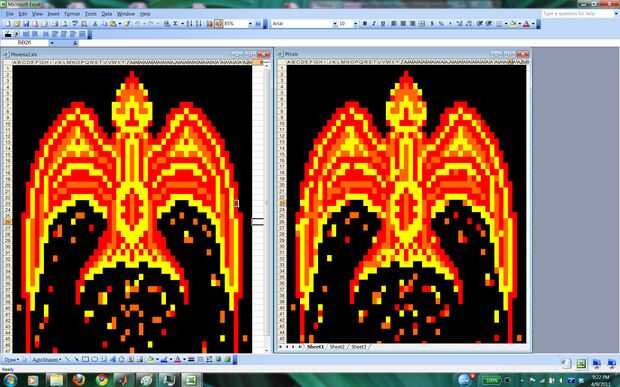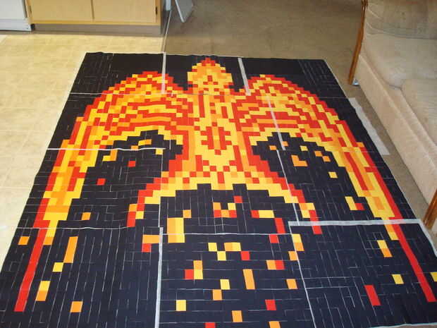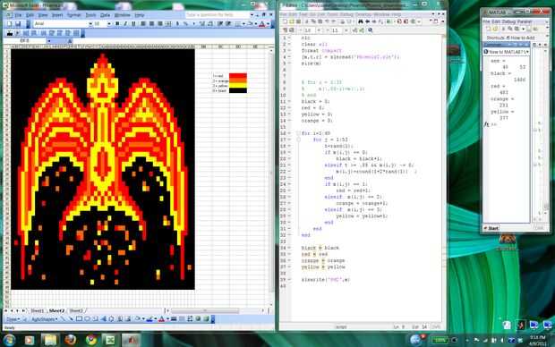 Para agregar un elemento de aleatoriedad para hacer Fénix parece estaba en llamas, escribí un programa MATLAB. El programa comienza con el diseño artístico phoenix y recorre el número de la matriz que representa el patrón; cambia al azar un determinado porcentaje de las células a un número diferente y por lo tanto un color diferente. Corrí el programa un montón de veces y había guarda los resultados. Entonces tomé mis patrones favoritos de un número del Fénix diferentes y había reensamblada en el patrón final.