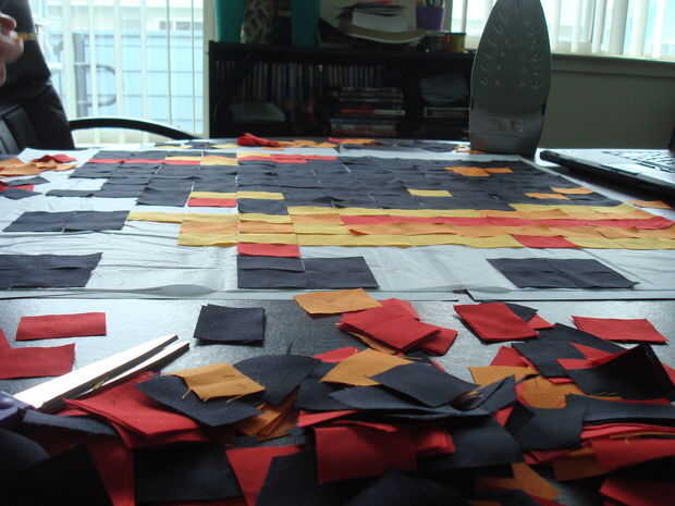 Para hacer el patrón cortar a mi tela en 1.25x1.75 pulgadas. El patrón contiene bloques individuales 2597. A excepción de algunas de las secciones de negro en la parte superior del edredón se compone enteramente de los pedazos individuales. Que masa producido mediante un cortador rotatorio.