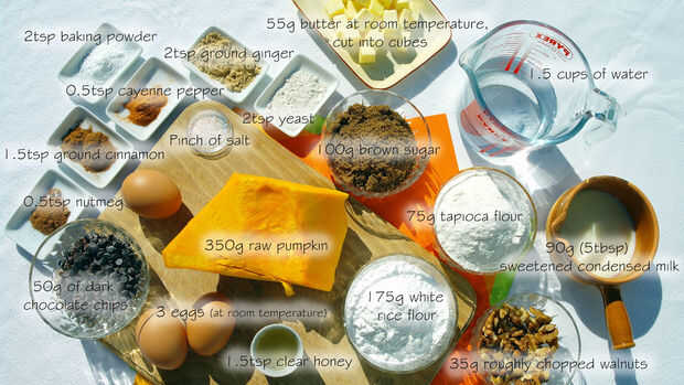 5. agregar la leche condensada, luego agregar el puré de calabaza frío y ver como todo vuelve naranja brillante! Entonces finalmente puede añadir trocitos de chocolate negro y nueces picadas a la mezcla y revuelva - asegurándose de que todo se combina y nada se queda pegado en la parte inferior.