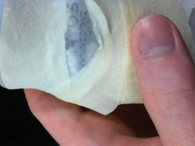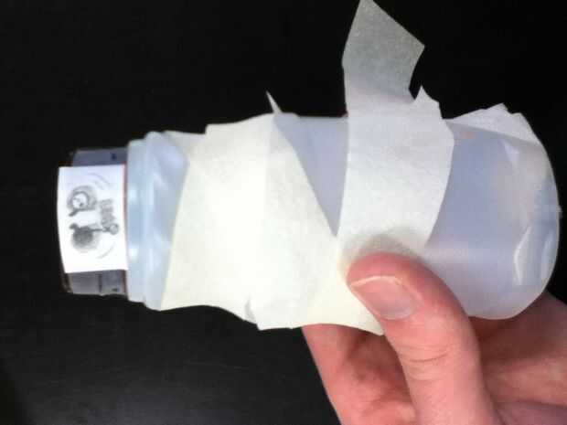 Ahora, empezar a envolver el papel alrededor de la botella y al final de la cinta hacia abajo. Salí de la fecha de vencimiento expuesta para el humor:).