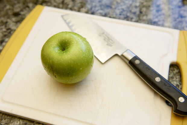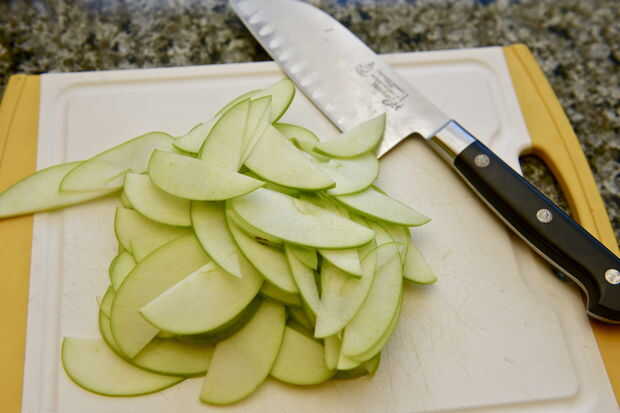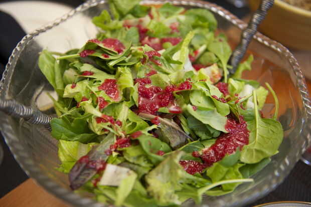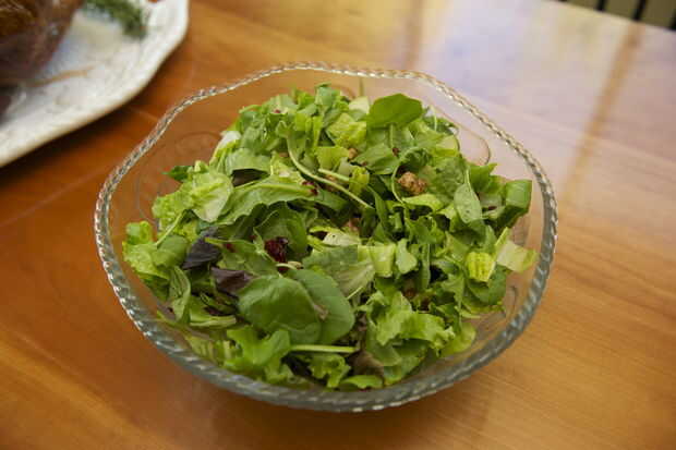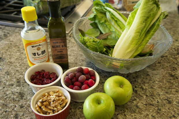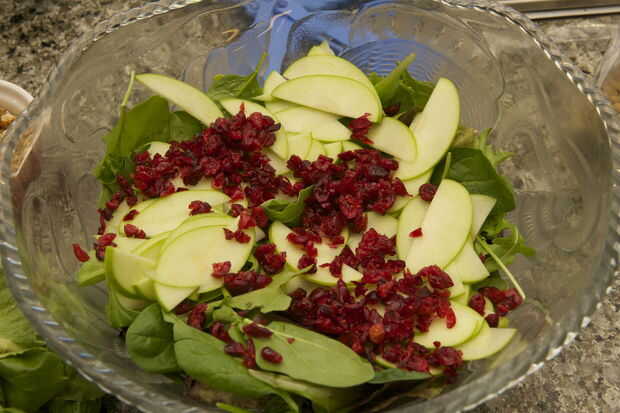 Extiende las nueces sobre una placa para horno y les tueste en el horno a 175 durante 10 minutos. Picar la lechuga en trozos pequeños bocados y mezcle en una ensaladera con los verdes mezclados. Cortar la manzana en rodajas finas y añadir a la ensalada. Espolvorear las nueces tostadas y arándanos secos en la parte superior y agregue la cantidad deseada de la preparación.