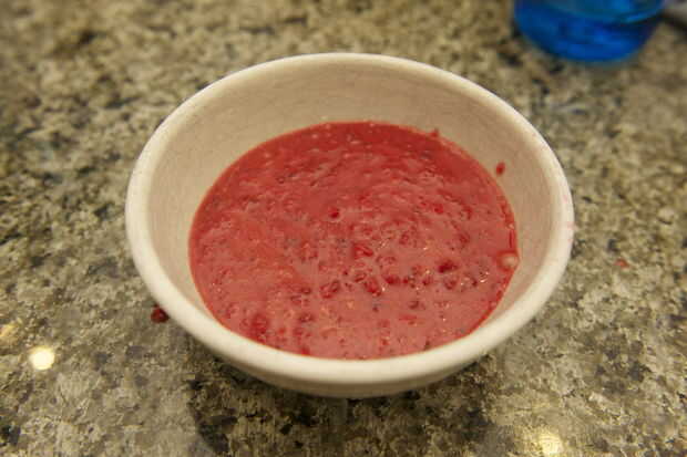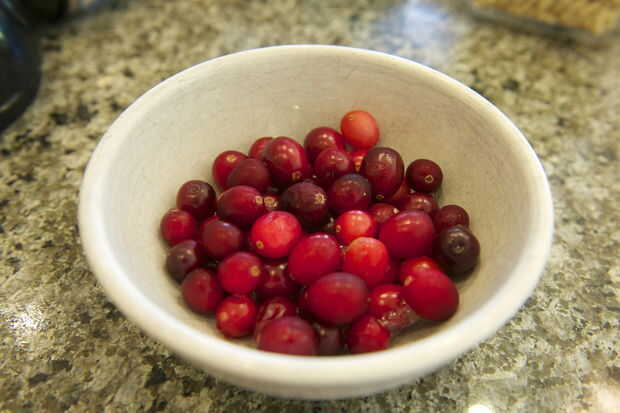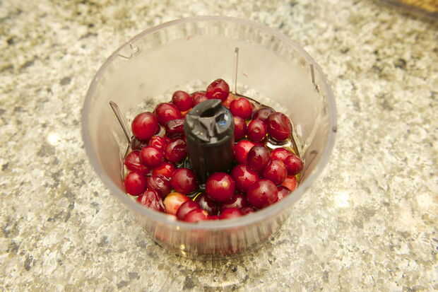 Microondas los arándanos rojos para uno o dos minutos hasta que empiecen a llegar fofo y se desmoronan. Los pulsos en un procesador de alimentos o licuadora con el resto de los ingredientes para un par de segundos para puré todo juntos. Si desea una preparación más dulce, agregar 1/3 de taza de jugo de naranja.