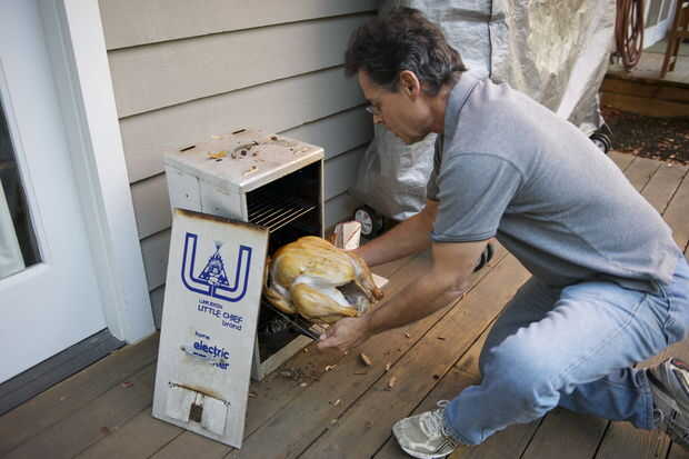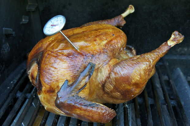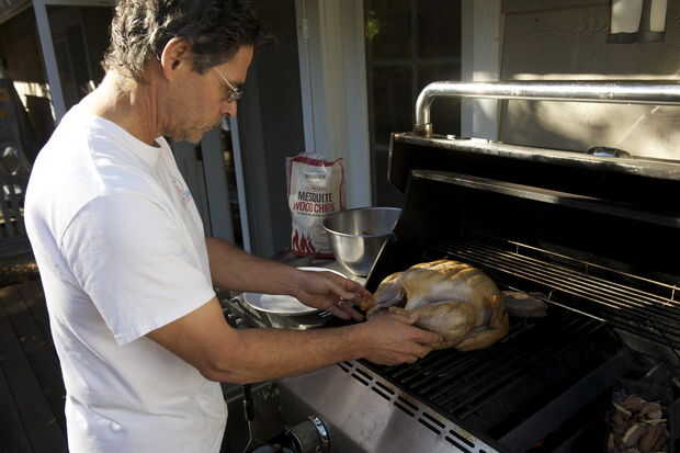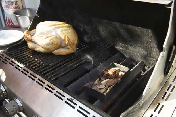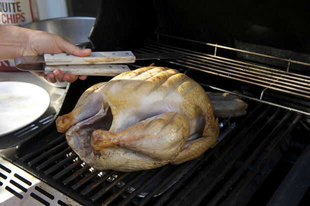 Ahora su tiempo a la parrilla. Coloque el pavo en un lado de la parrilla y gire en el otro lado a fuego lento. Esto cocina el pavo lentamente porque su indirectamente calentando. Si quieres sabor más ahumado, añadir una caja de virutas de madera húmedas en la parte superior el lado caliente y sostener la parrilla campana abierta una pulgada para que usted obtenga un flujo de aire a través de la rejilla. Otra vez, sustituir las virutas de madera cada hora o así.
