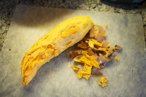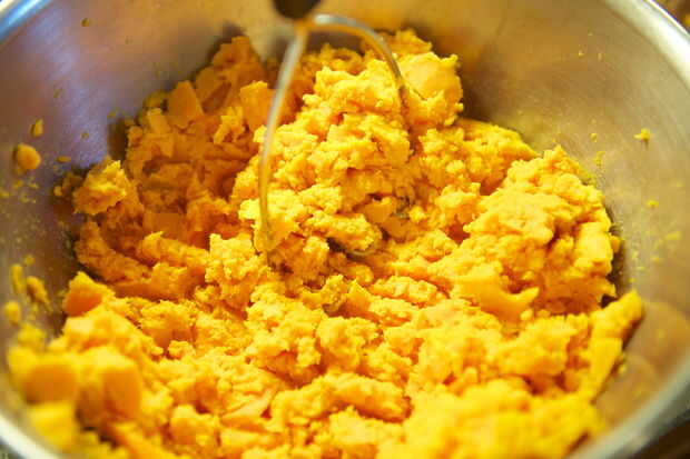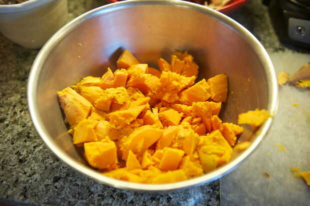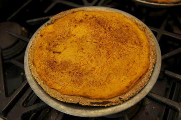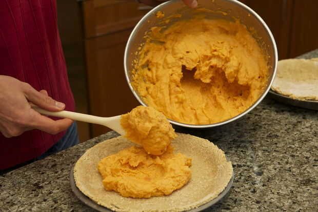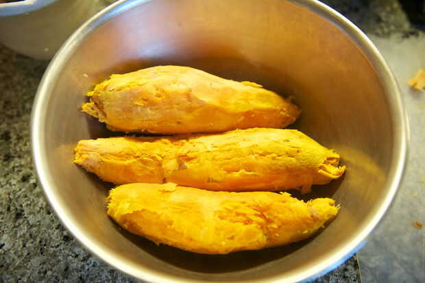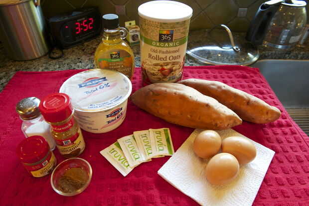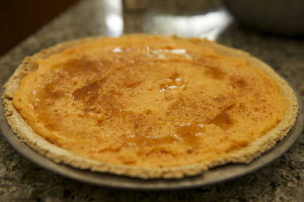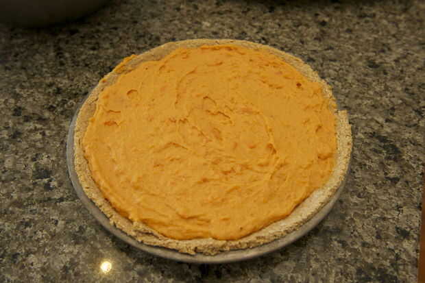 Lavar y fregar las batatas, luego microondas uno en un tiempo de 5 minutos o hasta que estén cocidas completamente (empujar un cuchillo a través de la piel y ver si pega algo duro, si lo más, microondas). La piel debe pelar apagado fácilmente después de cocinar. Una vez que se quita la piel, puré en un bol con el resto de ingredientes. Mezcladores de la hornada ayudarán con este proceso. Una vez que el relleno suave, agregar el relleno en la tarta, Espolvoree la stevia uniformemente sobre el pastel. Había espolvoreado algo de canela y nuez moscada por encima, así y rociados un poco más libre almibar en él también. Hornear durante unos 50 minutos a una hora a 350 grados (o hasta que un palillo salga limpio).