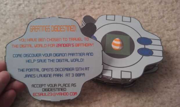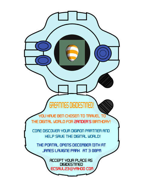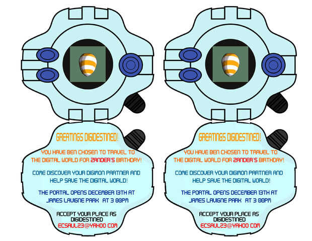Las invitaciones son digivices. Diseñé en photoshop usando una imagen de un digivice en google. El archivo es editado fácilmente ya que es solo texto. Leyeron: