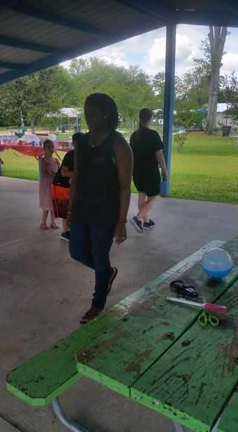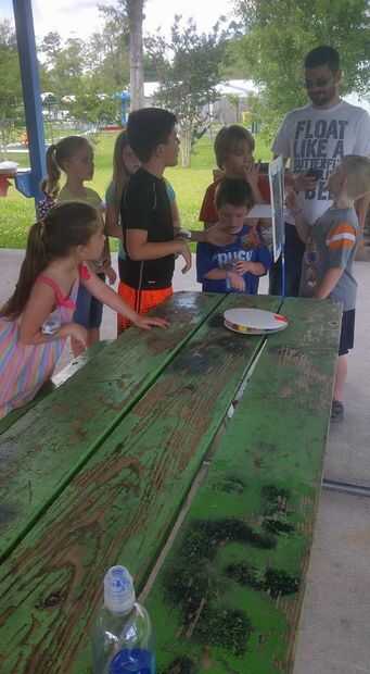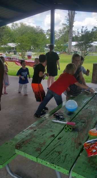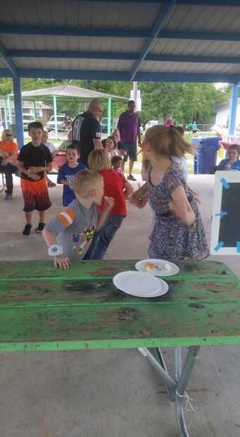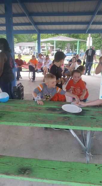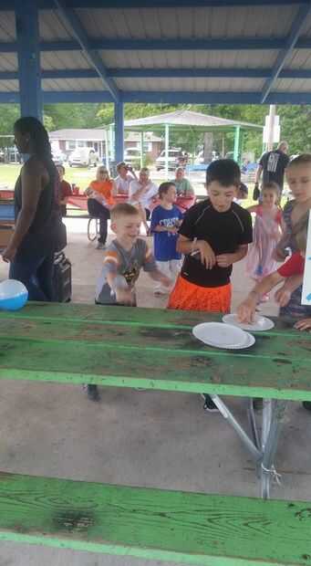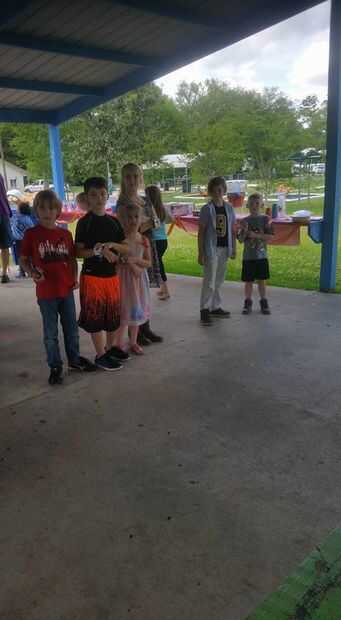 Los niños de la línea hasta al lado del otro frente a la mesa cerca de 5 pies o tan lejos.