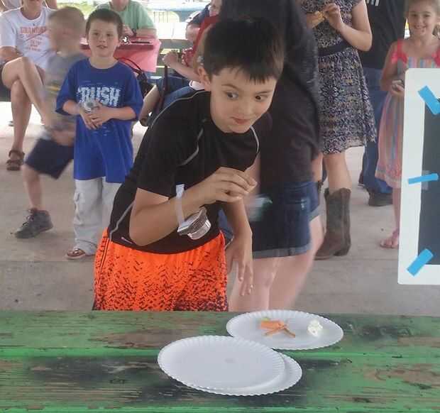 Para este juego puse un plato de comida en una mesa. Tenía pocos alimentos de los bocadillos de fiesta: trozos de piña, una fresa, rodaja de plátano, pretzels, palomitas de maíz, un marshmellow, zanahorias baby, un gomoso y una bola de pastel.