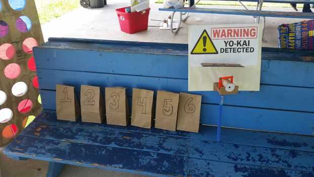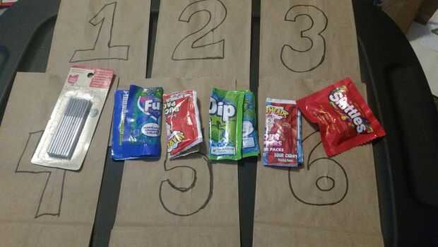 Ahora hacer las bolsas de secreto. Toma 6 bolsas de almuerzo de papel y número de ellos 1 a 6. Poner algo en una pesa hacia abajo. Usé algunos paquetes de diversión dip. En la última bolsa de pone las velas de cumpleaños. Pongo minas en la bolsa número 6.