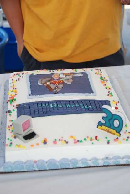 Hice un cartel grande collage con fotos de mi marido de los últimos 30 años, usando el tablero del corcho, clips de papel, tarjetas, llaves de computadora y otro tipo de artículos de oficina. El menú consistió en bocadillos, patatas fritas y queso, aperitivo bandejas llenas - de verduras, queso, galletas - Ect. Compré un teclado viejo en la tienda y tomó todas las claves de la misma, con el fin de utilizarlos para las bandejas de aperitivos. Pegué en las teclas de la computadora a las esquinas de las bandejas de aperitivos y he hecho selecciones de queso con palillos y las teclas otra vez.