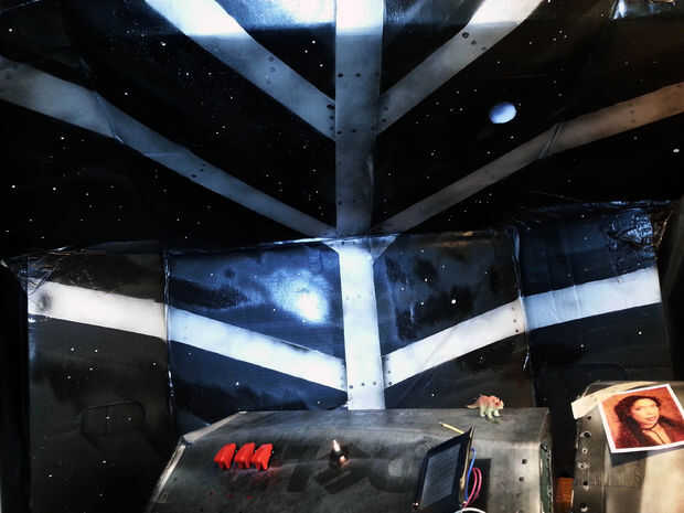 La ventana de vista es una caja grande que fue doblada y ductaped esté en posición vertical. Utilice cinta de enmascarar (con periódico para rociado) para hacer las vigas. Comience con la viga principal de pintura una raya de plata maciza. Añadir dimensión ligeramente pintando los bordes negros. Repita este paso para todas las vigas laterales. Agregar tus puntos de cabeza de tornillo. Las estrellas son sólo puntos de pintura blanca. El planeta y la luna se hizo rociando pintura blanca dentro de un tubo de papel higiénico.