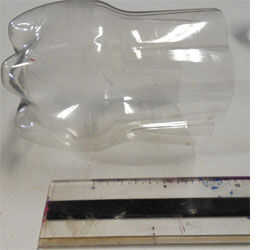 Algunas botellas tienen guiones verticales y usted puede utilizar estas para cortar las líneas hasta el fondo. Si la botella no tiene ningún guión, dividir en 5 partes iguales.