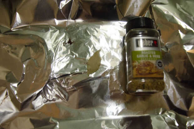 Condimentos. La hoja de una bahía, pizca de Chile en polvo (literalmente, sólo una pizca.) y uno de mis condimentos favoritos de Weber. Ajo, sal y pimienta funcionan bien también. Y algo de sal para quitar el polvo de la parte superior de su comida.
