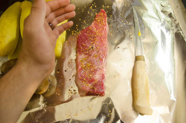 Añadir tus especias a la sartén y luego acaricie un poco sobre la carne.