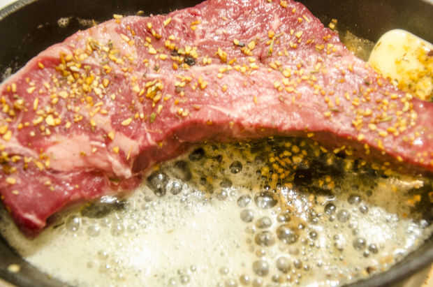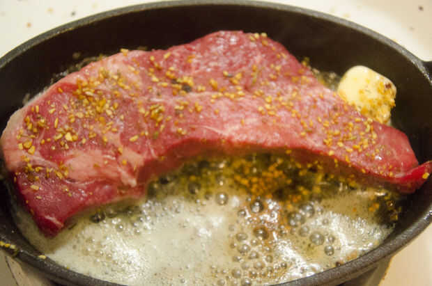 Defina su carne con especias a la sartén directamente en la mantequilla y las especias y lo cerca de su fuego por lo que el pan permanece agradable y cálido. Si la mantequilla está burbujeando eres bueno.