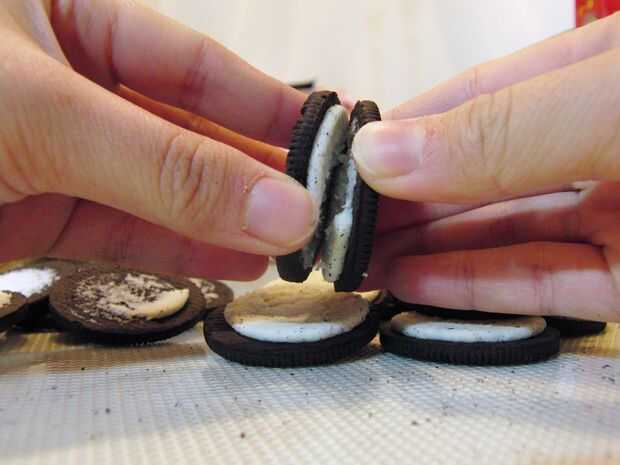 Primero dividir la galletas Oreo por la mitad. Intente mantener la crema en un lado. Gran paso para los más pequeños ayudar. :)