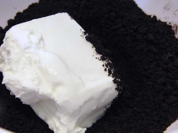 Derramar la galletas Oreo machacada en un recipiente y añada 4oz de queso crema. Use la espátula de goma y combinar uniformemente.