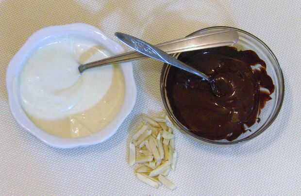 Aquí había derretido chocolate. Tengo algunos blanco chocolate para decoraciones dibujo su rostro y chocolate oscuro para sabores sofisticados. También preparé unas almendras para algunas crisis. Experimento con chispitas, frosting, las migas de cereal, bombones y galletas.