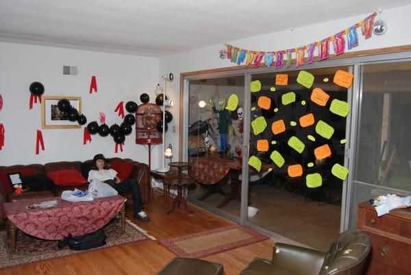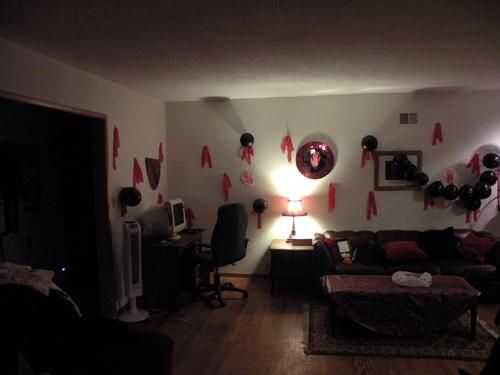 PERO... Una cosa que me enorgullece - utiliza los envoltorios de plástico y basura desde las cosas partido a hacer decoraciones. Tomó pintura acrílica rojo y había estampado mi mano en el celofán limpiado, luego había manchada, como sangre mano arrastrando por vidrio o algo. Entonces los Tomé y pegadas a la pared y parecía un poco manos sangrientas en las paredes. SUPER barato y muy fácil de hacer. Con la basura. Jaja.