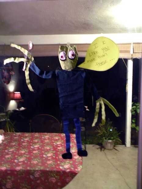 Yo también le hizo un animal de peluche de los dedos de la ensalada con una cuchara de metal. Grabado sobre la puerta corrediza de vidrio, junto con algunas citas de zombie favorito para mantener el tema. Aunque él no notó demasiado, él fue bombeado con Jagermeister. jajaja
