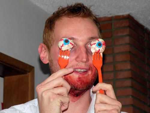 Mi cosa favorita que hice, fueron estos ojos! Vi la idea aquí, en instructables, pero hizo un lil más realista porque quería estar más cerca de "miedo" para el tema zombie. Acaba de poner los agujeros del buñuelo en horquillas, hizo la cosa todo chocolate, pero luego espolvoreado azúcar roja para hacer los ojos "inyectados de sangre" y utiliza el conjunto de 4 colores estándar de tubos "glaseado de la galleta" de la sección de pasteles en el supermercado. Estaba taaan feliz de ver que templado y parecía perfectos. Amaba. :)