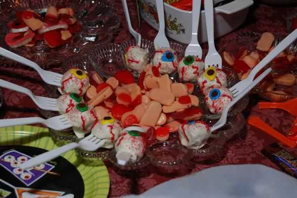 También puse caramelo en tazones de fuente que era del despacho de Halloween, los dulces de partes del cuerpo. Forma de orejas, dedos, etc.. Eran perfectas para el tema!
