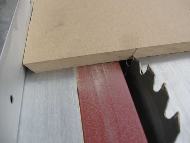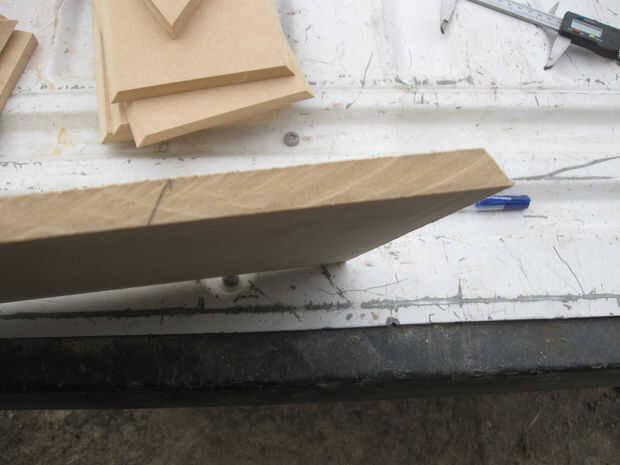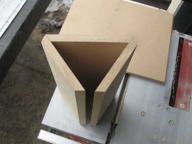 Cortar una plantilla del contorno de 1/2 pulgada MDF, que luego se utiliza para establecer el ángulo de corte de Sierra de mesa. Se corta un extremo de una sección de 8 1/2 pulgada y la sección de 11 pulgadas de MDF con un bisel entonces la Junta es volteada y se hace otro corte que crea el lado corto del MDF 3 1/2 pulgadas para la 8.5 y 5 para las 11. Esto es repetido 3 veces más para cada uno.