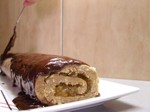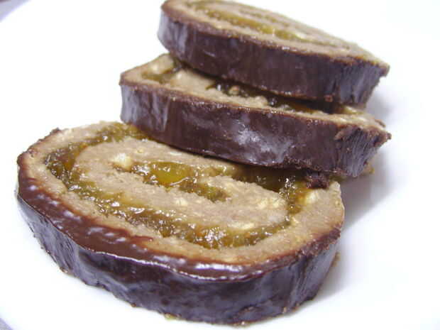 ¿Hay algo más rápido que este pastel de rollo? Es crucial que ha molido finamente galletas, gelatina de higo y chocolate... todos los otros ingredientes son opcionales y puede implicar su creatividad para cambiarlos. Esto no es hornear pastel de invitados inesperados o una rápida después de postre del almuerzo. Créeme cuando te digo que la torta sirvió su propósito y desapareció después del almuerzo como vino.