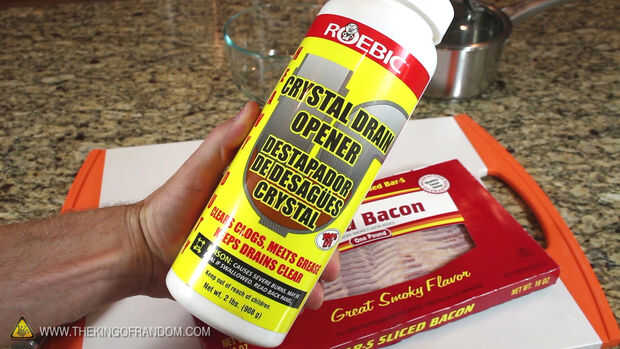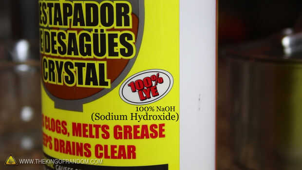 Para hacer este proyecto un poco de una torcedura, he intentado utilizando 1 libra de tocino "Estilo americano" porque es muy graso, y algunos abrelatas del dren cristal marcaron como lejía de 100%. Es muy importante que esto es 100% lejía, y si hay alguna duda, no debería utilizarse. El objetivo aquí es 100% hidróxido de sodio, que este envase es, según la hoja de datos de seguridad Material (MSDS).