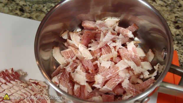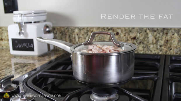 Esto se logra mejor por cortar el tocino en trozos muy pequeños y colocar en una olla con una tapa, a fuego lento.