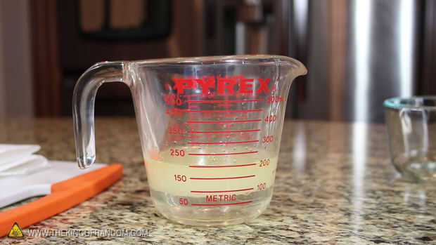 Para "aclarar" la grasa, vierta un poco de agua en el recipiente y observar la mezcla separada en 2 capas diferentes. La grasa clarificada flota en la parte superior, mientras que el fregadero de agua y las impurezas en la parte inferior.