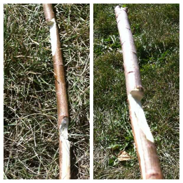 En el palo más largo corte un cuadrado de la muesca que se ajusta perfectamente con el punto cuadrado sobre el palo oscilante 2/3 de abajo el palo y luego una plaza en forma de gancho/muesca, 5-6 pulgadas de la primera muesca, que se enganchan en la parte cuadrada del principal-bastón