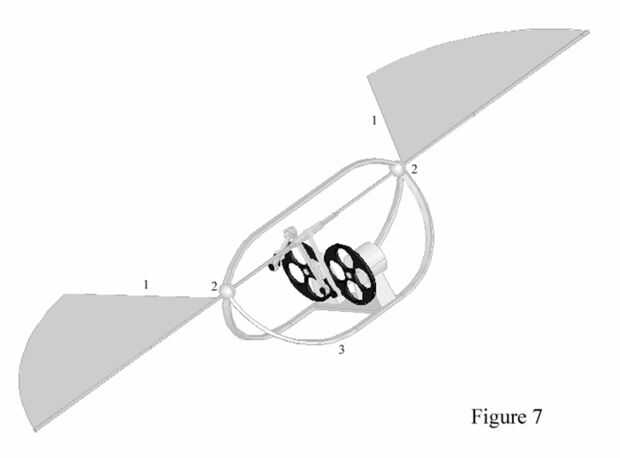 Aquí es un concepto para un micro vehículo aéreo. Esto representa más de cerca cómo sería volar un colibrí o un abejorro. Otra opción que no se muestra aquí es unir las alas directamente en la unidad, en otras palabras puntos 2 fijarse en los brazos del conector y no el marco 3.