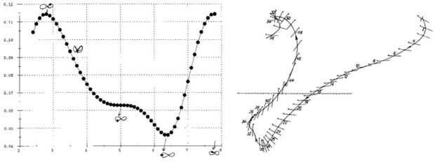 La gráfica derecha muestra mediciones reales de la fotografía de alta velocidad de una mosca o abeja en movimiento hacia adelante. (Referencia a seguir)