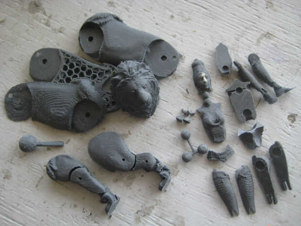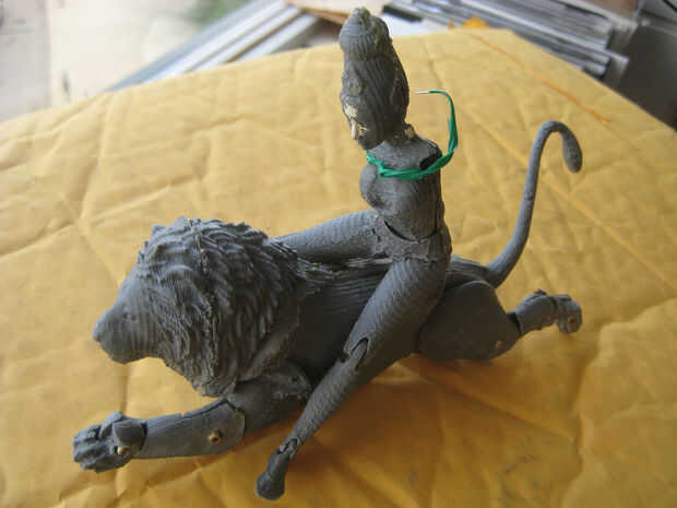 1. rótulas. Durga tiene articulaciones de bola en su cabeza, cintura, caderas, codos y tobillos. Estas articulaciones permiten un amplio rango de movimiento hacia adelante y hacia atrás, hacia arriba y hacia abajo. En la impresión de baja resolución (la versión gris), se puede ver que mientras su cadera, cintura y las articulaciones de la cabeza de impresión y trabajo muy bien, no era posible imprimir sus brazos con las articulaciones de codo y la muñeca de bola-estilo (demasiado pequeña, impresora suficientemente no muy precisa). El León también tiene articulaciones de bola en su cabeza y su cola.