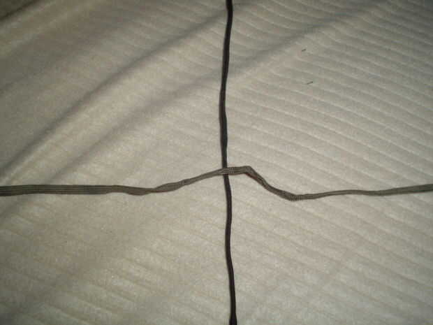 Para hacer las piernas, tomar dos pedazos de paracord, cada uno de aproximadamente 18 a 24 pulgadas y los ponen en el suelo, en un diseño de Cruz. Ejecutar la cuerda vertical a través de una TallyMans Pelvis lazos. (He dejado el cuerpo de esta foto para mayor claridad. Ver paso 16 para la foto de la fijación pélvica...)