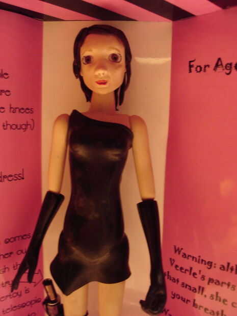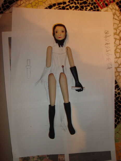 Usé Fimo "Miniatura" para las piezas de color de piel. Las botas y los guantes se hacen en Fimo negro "Suave", el pelo en marrón y el blanco de los ojos en blanco "brillan en la oscuridad". El vestido fue cortado de un globo negro (látex por lo tanto, real). Pinté el vestido, botas y guantes con tinta china. El vestido seguía siendo flexible.